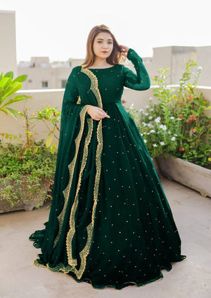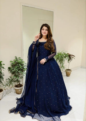 Get ready to dazzle with this stunning long flare chiffon maxi, beautifully designed with front and back pearls and lace work, making it a perfect choice for festive wear, weddings, and formal events.
