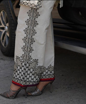 🔸 Trouser: Wide-leg trousers with matching embroidery and red lace finishing on the hem